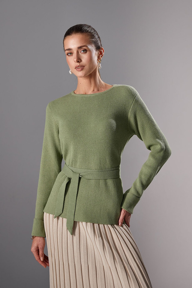 Жіночий в'язаний трикотажний джемпер з поясом оливкового кольору. Модель 2433 Trikobakh