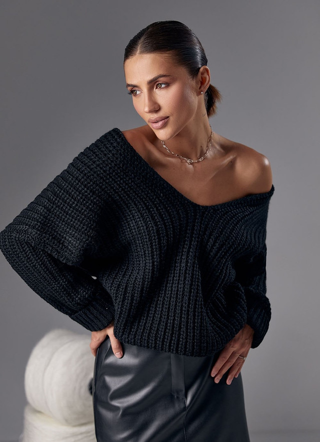 Жіночий в'язаний однотонний джемпер чорного кольору з вирізом. Модель 1619 Trikobakh. Розміри 42-46, 48-52