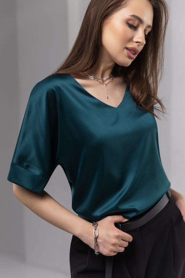 Блуза жіноча шовкова з коротким рукавом смарагдового кольору. Модель 3022