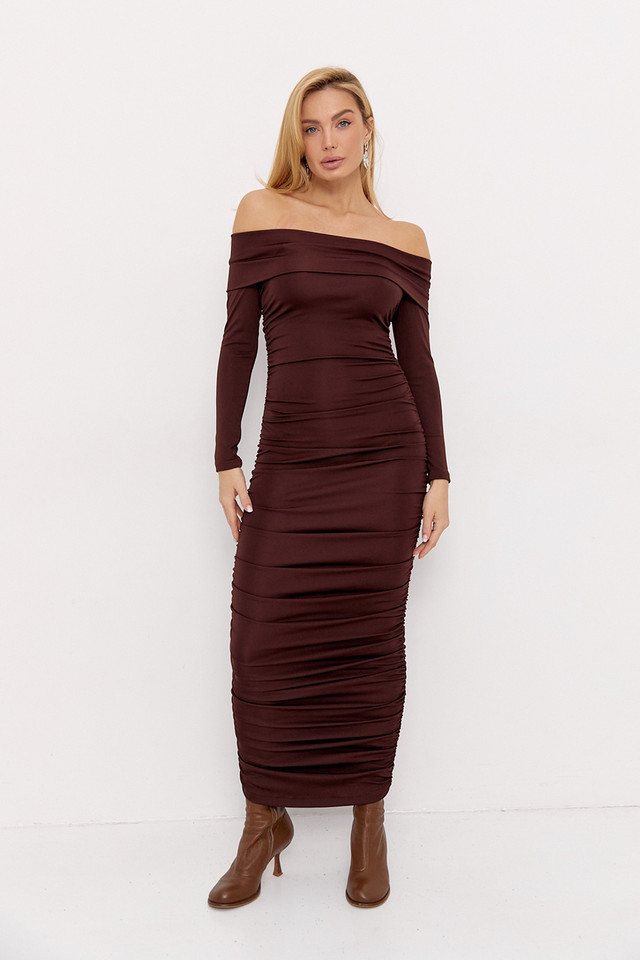 Довга силуетна сукня з відкритими плечима коричневого кольору. Модель 10225