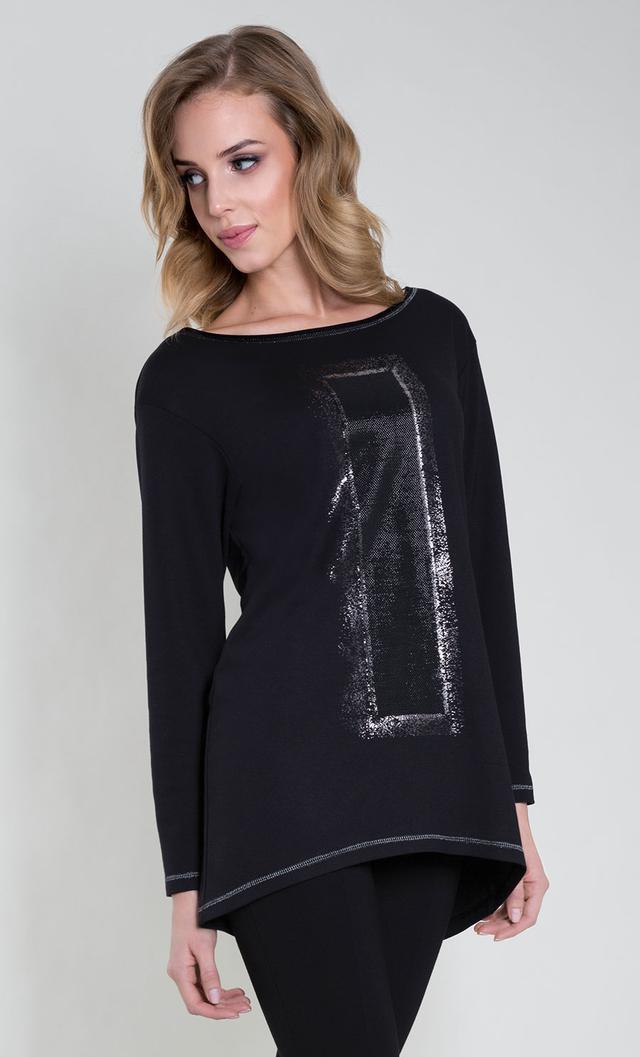 Стильна жіноча туніка асиметричного крою. Овальний виріз горловини, довгий рукав. Горловина, низ і рукава декоровані контрастною ниткою сріблястого кольору. Перед прикрашений сріблястим напиленням. Тканина щільна, приємна на дотик, добре тримає форму. Модель повномірна.
