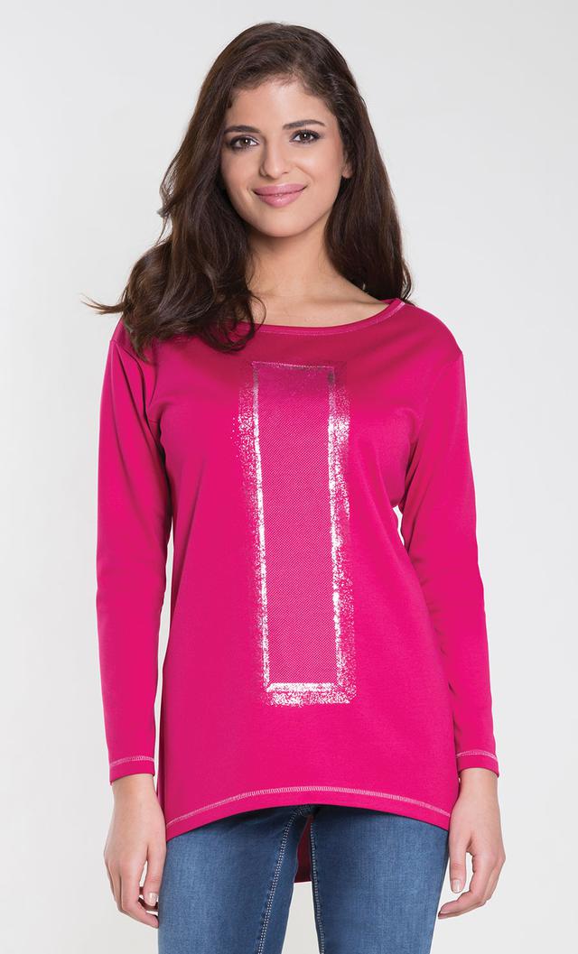 Стильна жіноча туніка асиметричного крою. Овальний виріз горловини, довгий рукав. Горловина, низ і рукава декоровані контрастною ниткою сріблястого кольору. Перед прикрашений сріблястим напиленням